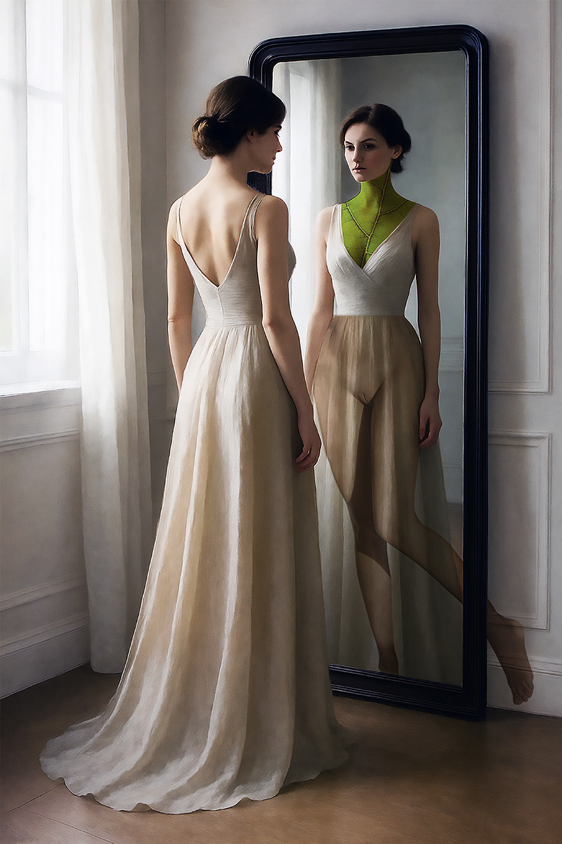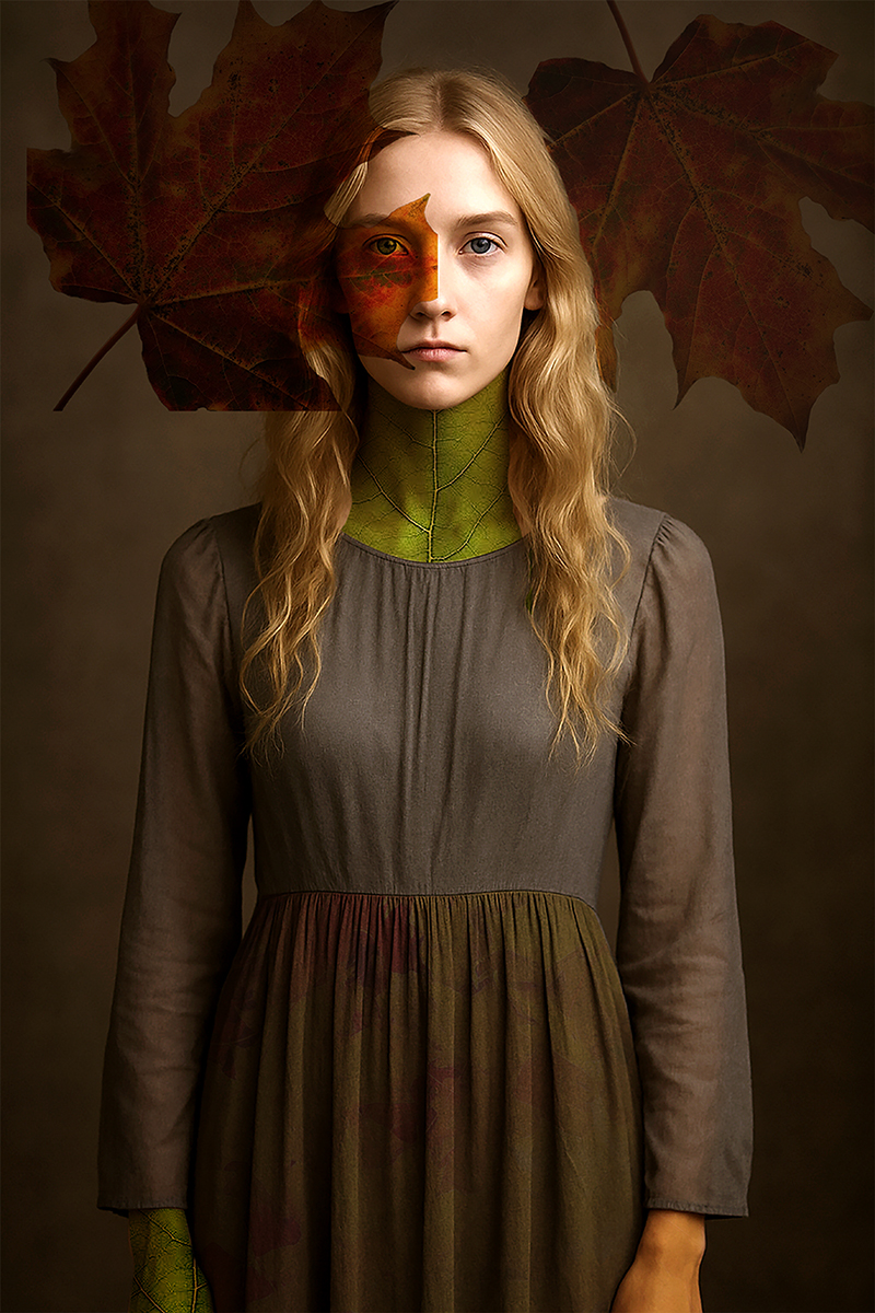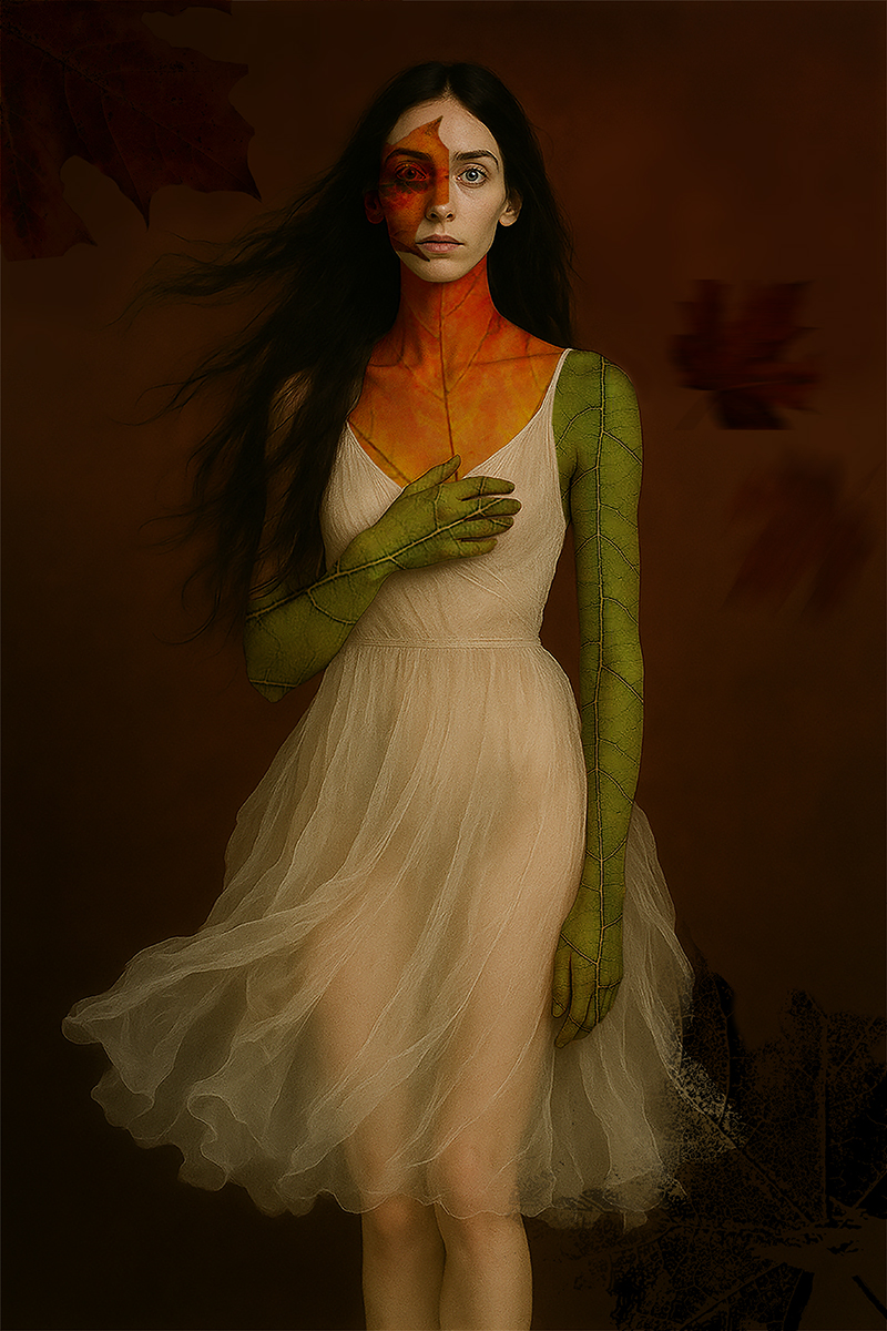 Tutte le mie fotografie d’arte parlano della donna, così come le mie poesie, usando AI, intelligenza artificiale, non potevo venire meno alla mia tesi creativa. La foglia, come metafora della vita e il sogno idem.